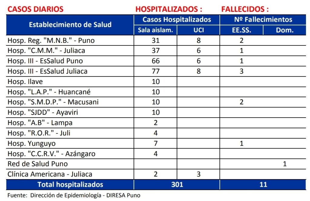 De los 11 fallecimientos producidos, corresponden; 02 en el Hospital Regional Manuel Núñez Butrón de Puno, 01 en el Hospital Carlos Monge Medrano de Juliaca, 01 en el Hospital III EsSalud Puno, 03 en el Hospital III EsSalud Juliaca, 02 en el Hospital de San Martín de Porres de Macusani, 01 en el Hospital de Yunguyo y 01 en la Red de Salud de Puno.