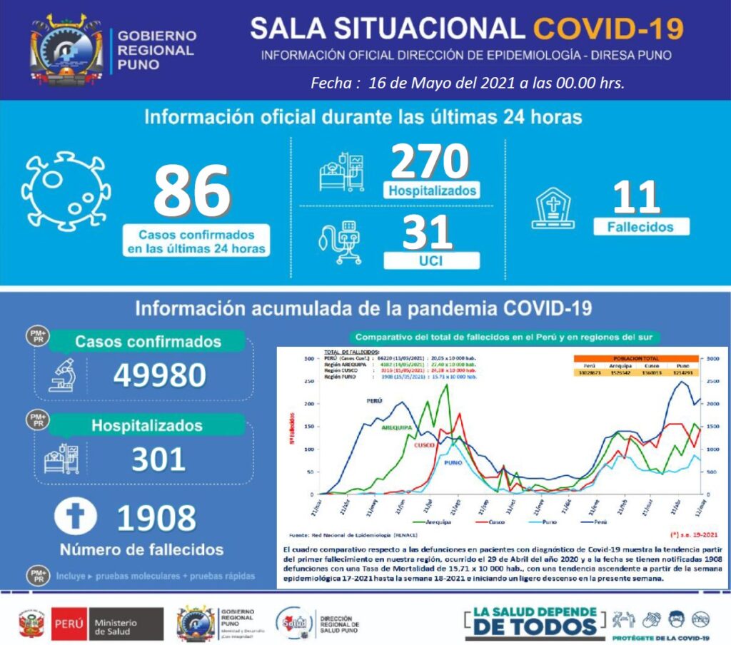 En datos acumulados, desde el inicio de la pandemia del nuevo coronavirus en la región Puno, hasta el 16 de mayo, la sala situacional COVID – 19, ha reportado 49,980 casos confirmados por el virus, 301 hospitalizados y 1,908 fallecidos en toda la región.
