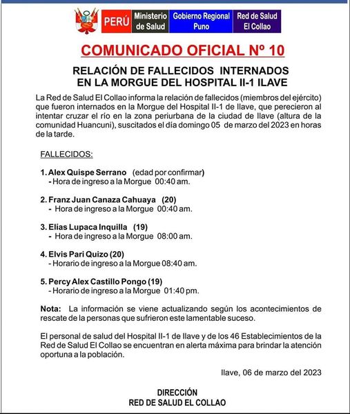 Confirman 5 soldados del Ejército muertos y 1 desaparecido en río Ilave de Puno. Los jóvenes rescatados por comuneros señalaron a un superior del Ejército de haberles dado la orden de cruzar el río Ilave.