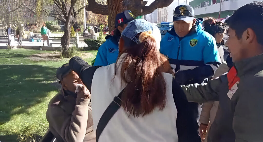Personal de serenazgo municipal de la agencia centro acudieron a un adulto mayor de aproximadamente 70 años, quien se encontraba sangrando por la nariz a raíz de ser atropellado por la línea 40 de transporte urbano, el hecho se suscitó en las intercesiones del Jr. Mariano Núñez con Jr. Loreto por la plaza Bolognesi de la ciudad de Juliaca.