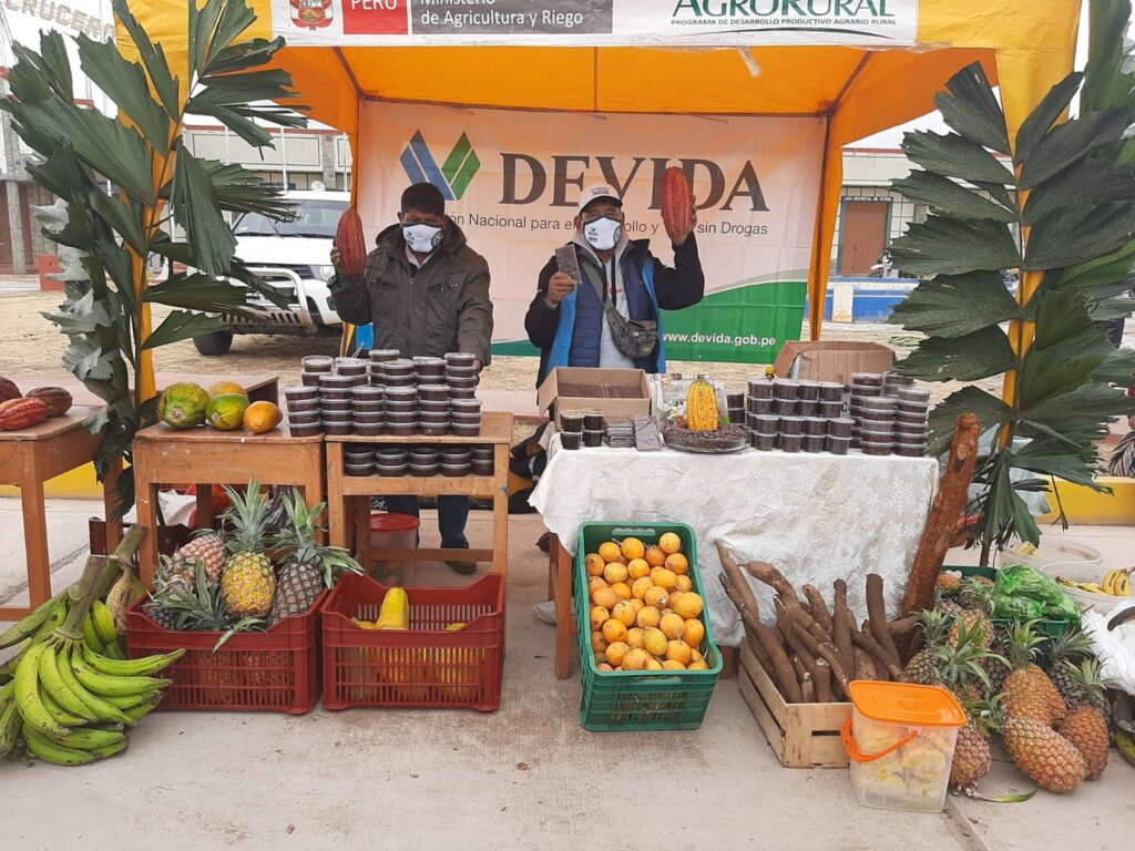 Los productores Dionicio Canccapa y Mauro Ramos comercializaron productos del desarrollo alternativo como pasta pura de chocolate, mazorcas de cacao, chocotejas, nibs, jarabe de cacao, plátano, mandarina híbrida, carambola y yuca, permitiendo acercar los bienes de primera necesidad del campo a la ciudad con precios accesibles y justos para las familias de la zona urbana.