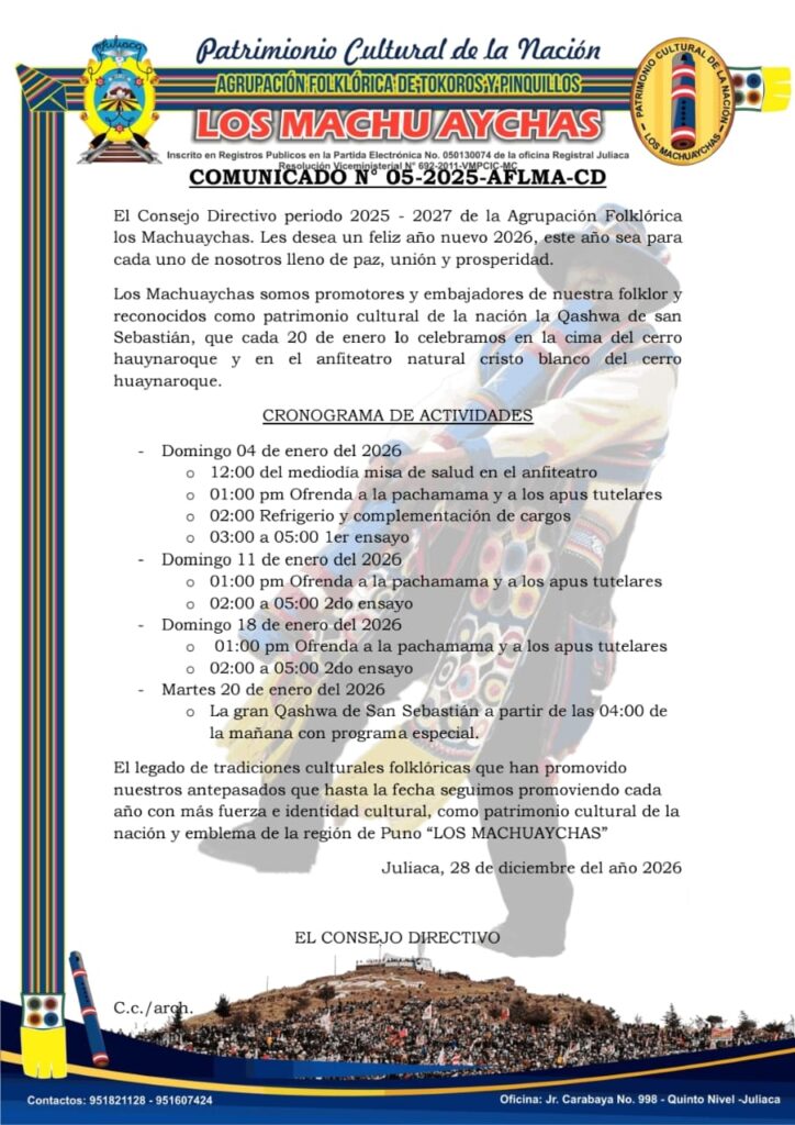La Agrupación Folklórica Los Machuaychas, reconocida como promotora y embajadora de la Qashwa de San Sebastián, patrimonio cultural de la Nación, dio a conocer su Comunicado N.° 05-2025, en el que anuncia el cronograma oficial de actividades rumbo a la celebración central del año 2026.