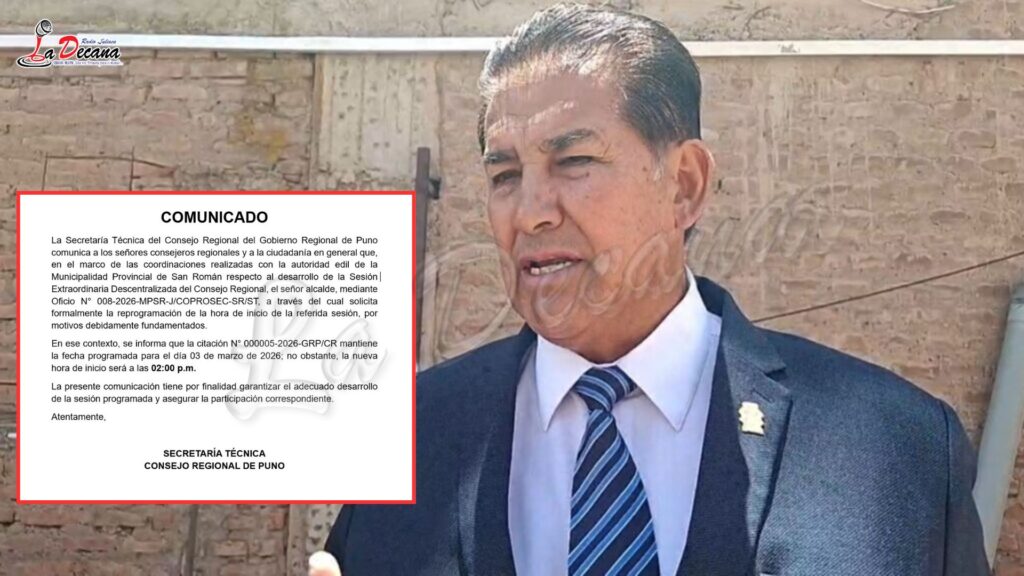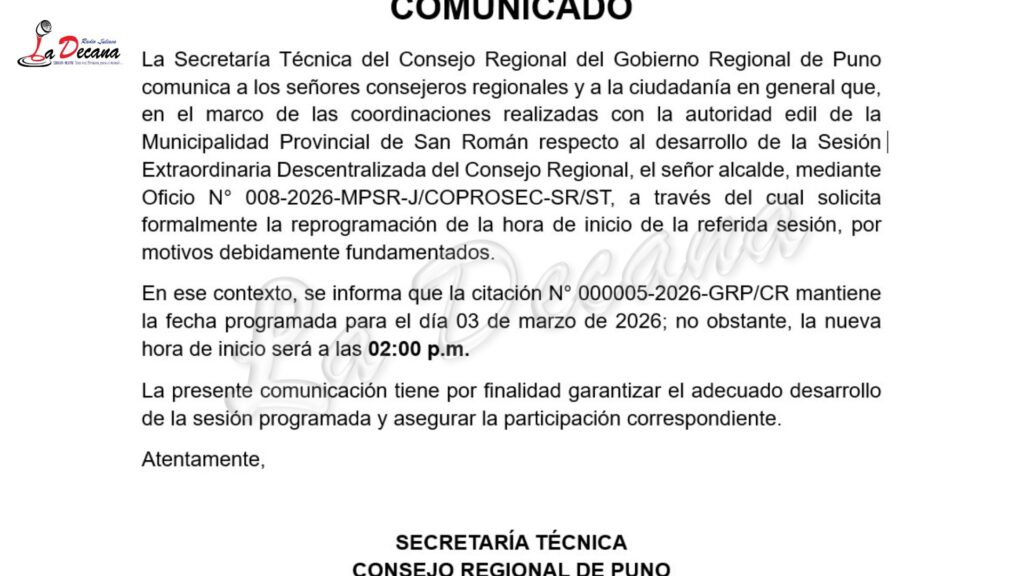 A través de un comunicado oficial, la Secretaría Técnica del Consejo Regional precisó que, tras coordinaciones con la autoridad edil de la Municipalidad Provincial de San Román, el alcalde solicitó formalmente modificar la hora de inicio de la sesión mediante el Oficio N.º 008-2026-MPSR-J/COPROSEC-SR/ST, argumentando motivos debidamente fundamentados.