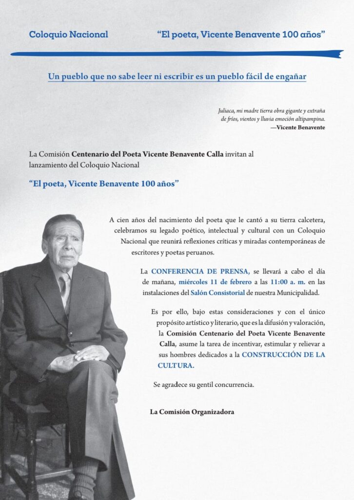 En el marco de las actividades conmemorativas por el centenario del natalicio del poeta juliaqueño Vicente Benavente Calla, que se recuerda cada 11 de marzo, el poeta y gestor cultural Walter Bedregal Paz anunció la realización de un coloquio nacional que se desarrollará durante el mes de marzo, con el objetivo de revalorar y difundir la obra literaria del destacado vate del sur del país.