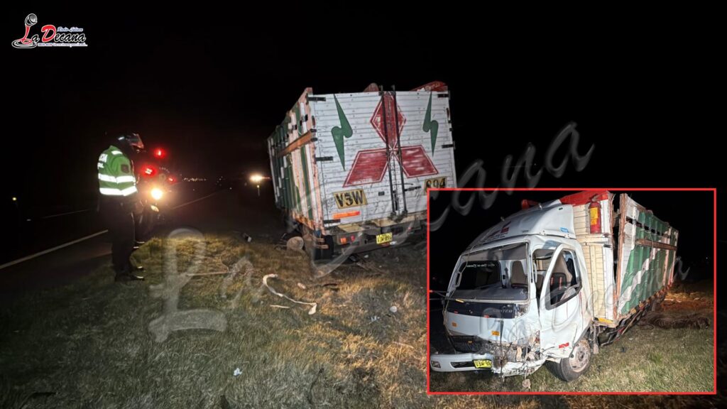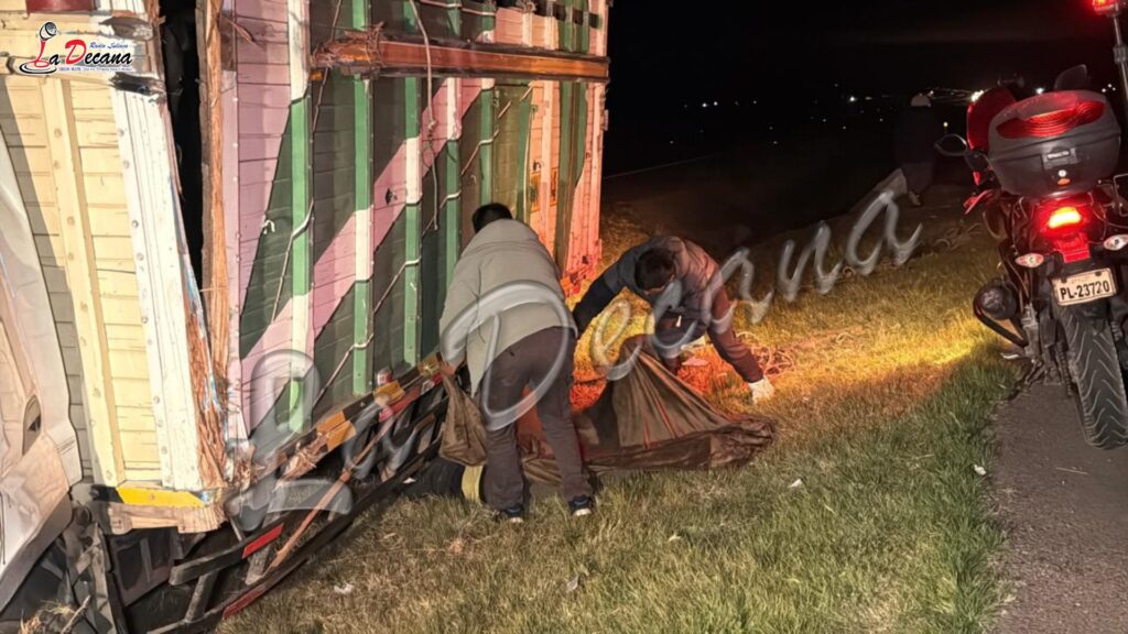 Un trágico accidente de tránsito se registró la tarde de este viernes en la carretera Juliaca–Puno, cerca del desvío a Capachica, donde un camión Mitsubishi Canter que transportaba ganado vacuno terminó fuera de la vía tras sufrir un despiste y posterior volcadura. El hecho ocurrió alrededor de las 5:00 p. m. y dejó como saldo una persona fallecida y otra herida.