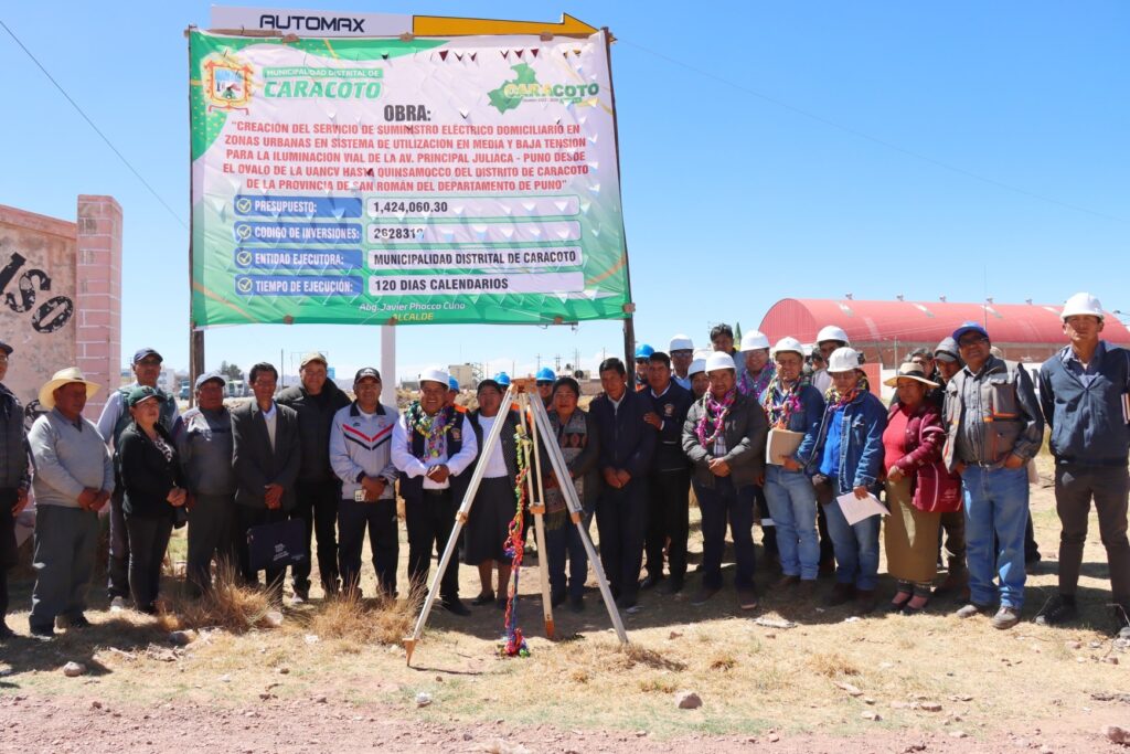 Con la participación de autoridades municipales, representantes de Electro Puno, dirigentes vecinales y vecinos de la jurisdicción, la Municipalidad Distrital de Caracoto dio inicio a la obra “Creación del servicio de suministro eléctrico domiciliario en zonas urbanas en sistema de utilización en media y baja tensión para la iluminación vial de la Av. Principal Juliaca – Puno, desde el óvalo de la UANCV hasta Quinsá Mocco”, con un presupuesto de S/ 1´424,060.30.