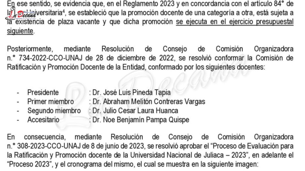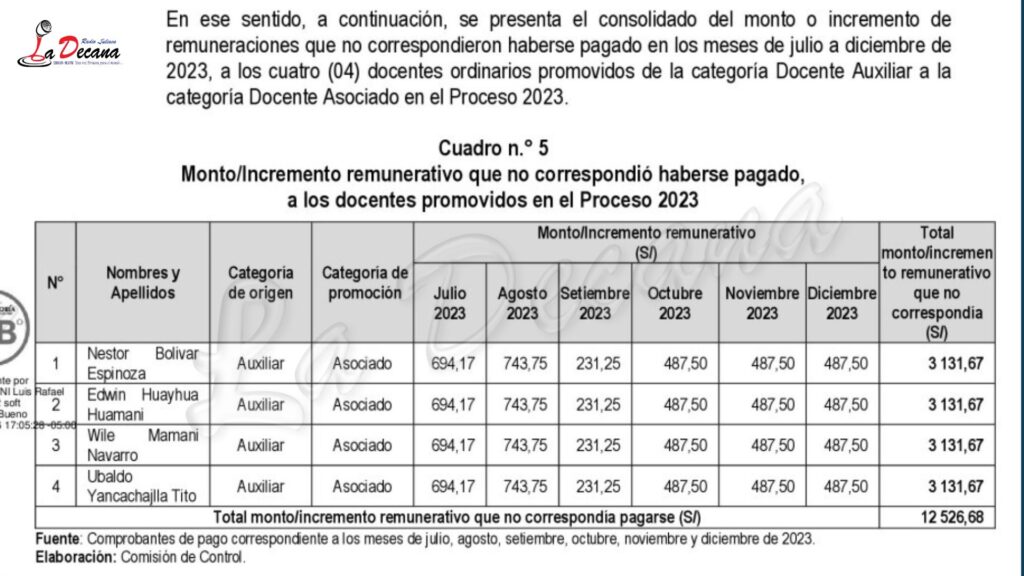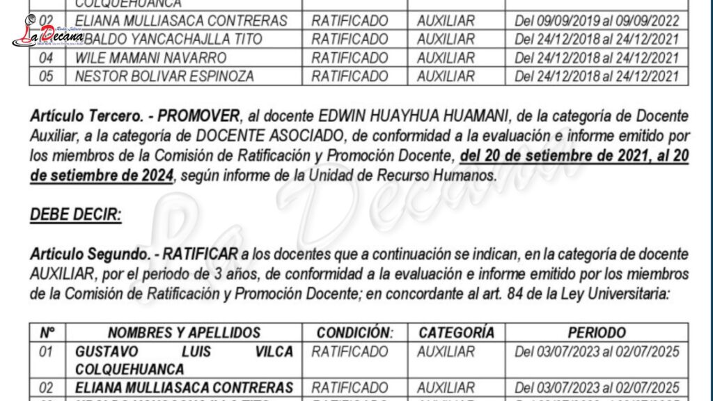 Entre los docentes beneficiados figuran Néstor Bolívar Espinoza, Edwin Huayhua Huamani, Wile Mamani Navarro y Ubaldo Yancachajlla Tito. La aprobación de estas promociones estuvo a cargo de la Comisión Organizadora de la universidad, presidida por Freddy Martín Marrero Saucedo, junto al vicepresidente académico Arrufo Alcántara Hernández y el secretario general José Luis Pacheco Cáceres. Asimismo, la Unidad de Recursos Humanos, bajo la dirección de Celso Víctor Benito Sagua, ejecutó las planillas y procesó los pagos.