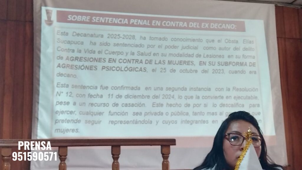 Durante una conferencia de prensa, Bernal Salas reveló que la sentencia, emitida el 25 de octubre de 2023 durante su gestión como decano, fue ratificada en segunda instancia. Asimismo, indicó que Sucapuca Luque enfrenta otras investigaciones en curso por presuntos casos de maltrato contra mujeres.