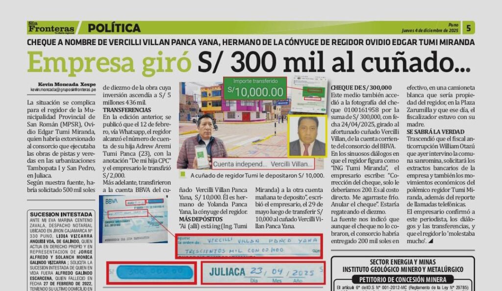La ciudad de Juliaca enfrenta una crisis de ética institucional tras la reciente sesión del Consejo Municipal, donde se rechazó la suspensión del regidor Ovidio Edgar Tumi Miranda. El dirigente Orlando Fernández, en declaraciones a La Decana Radio Juliaca, calificó la decisión como un «blindaje» orquestado por la mayoría de los fiscalizadores, quienes habrían optado por ignorar pruebas de una presunta red de extorsión y coimas que involucra directamente al entorno familiar del regidor.