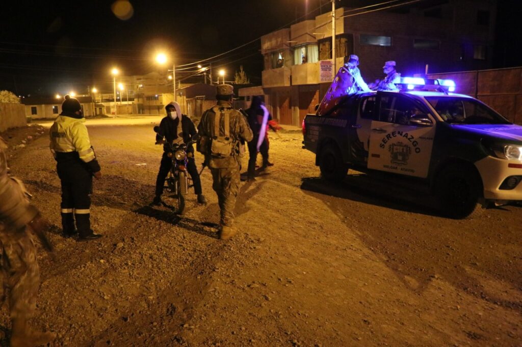 La noche del ultimo viernes, salió a las calles de la ciudad de Ayaviri el Ejército Peruano, Policía Nacional y personal de Serenazgo de la Municipalidad de Melgar, para hacer cumplir las restricciones sanitarias y el toque de queda, de acuerdo al Decreto Supremo Nº 092-2021-PCM, asimismo con esta disposición esta provincia se encuentra en nivel de alerta extremo por el masivo contagio de la covid-19.