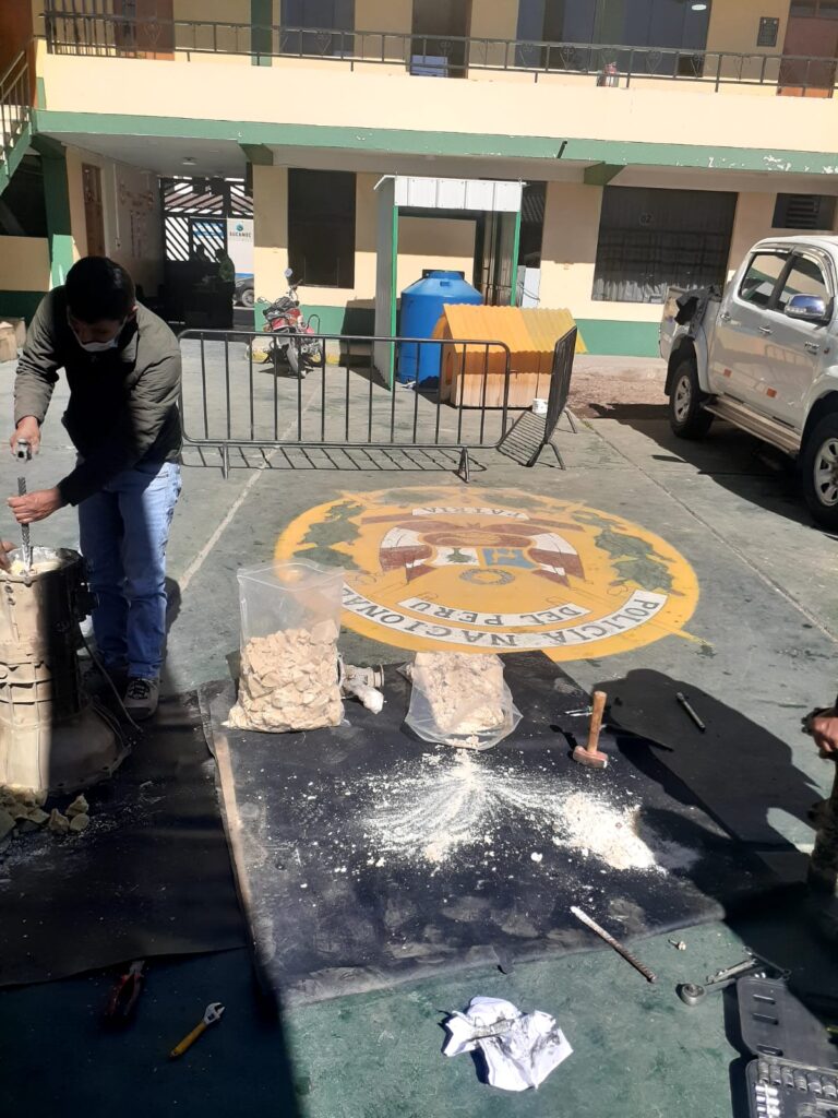 Cabe destacar que, aproximadamente a las 12:45 del 25 de junio 2021, con participación del instructor de la Policía Nacional del Perú, Dr. Mardux Huahuasoncco Caballero; PNP Paty Hilasaca Chura; Perito Ingeniero Químico, Defensor Público Dr. Dany Aldo Cati Vilca. Se resalta que, en detención, Eduardo Apaza Apaza (24); se inició con el deslacrado extracción de una (01) caja de cambios 4×4, y una (01) corona 4×4 consistente en una estructura metálica en cuyo interior se encontrada acondicionada una sustancia sólida, compacta, dura, parduzca al parecer alcaloide de cocaína, procediendo a realizar la prueba de campo con el reactivo químico thiocinato de cobalto, dando una coloración azul turqueza con indicativo positivo para alcaloide de cocaína.