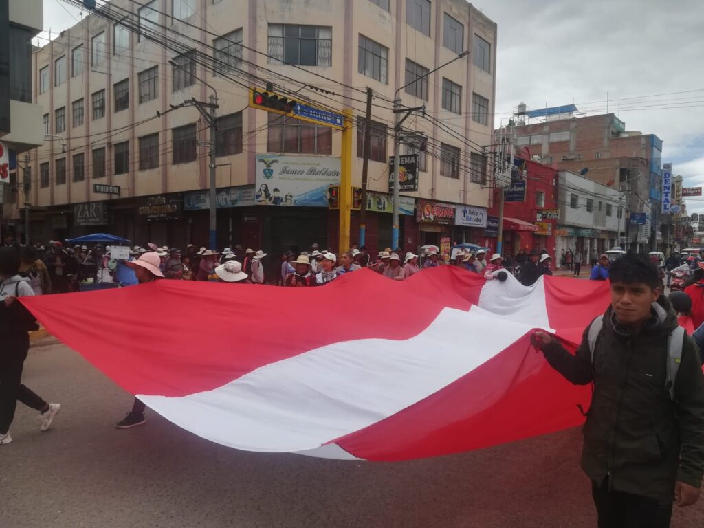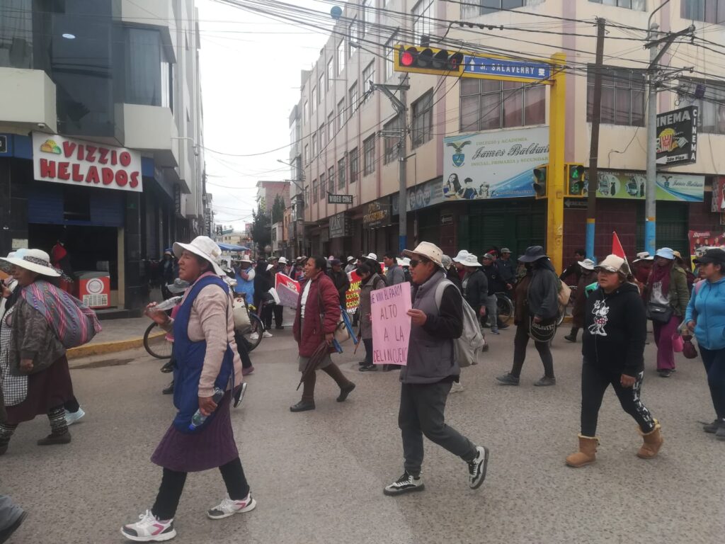 Tal como se tenía previsto se cumplió el primer día de paralización, donde la diferentes organizaciones sociales luego de realizar bloqueo en las principales salidas de la ciudad de Juliaca, se trasladaron hasta la plaza de armas de nuestra ciudad para pedir el cierre de las cantinas y justicia para la dirigente de la urbanización Villa Hermosa del Misti, con cartelones en mano llegaron los manifestantes en ellos se podía leer “alto a la delincuencia, señor alcalde donde está el plan pitbull, señores autoridades hagan bien su trabajo entre otros, además muchos de los manifestantes portaban la bandera negra con blanca, globos negros en solidaridad con la familia doliente.