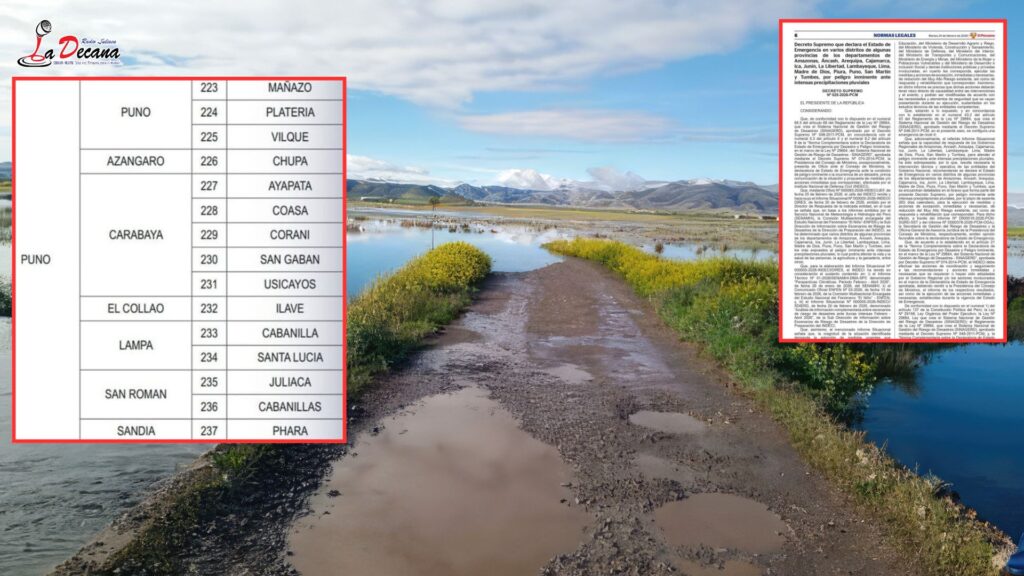 El Gobierno central declaró en estado de emergencia 15 distritos de la región Puno por peligro inminente ante intensas lluvias, por un plazo de 60 días. El Decreto Supremo N° 025-2026 de la Presidencia del Consejo de Ministros busca ejecutar medidas de excepción, reducción de riesgo, respuesta y rehabilitación inmediatas.