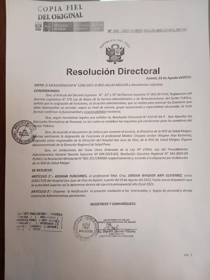 Bajo Resolución Directoral Nro. 385-2021-D-RED-SALUD-MELGAR/U.RR. HH, de fecha 23 de agosto del presente, resuelve en su Artículo 1. asignar funciones, al profesional Médico Cirujano Jordan Wagner Arpi Gutiérrez, como director del Hospital San Juan de Dios de Ayaviri, a partir del 23 de agosto del 2021, hasta nueva disposición que la autoridad superior así lo determine dentro del ejercicio presupuestal año fiscal 2021.