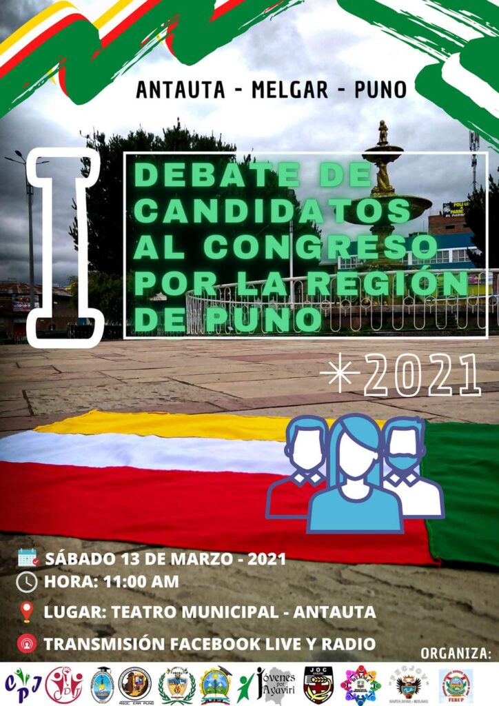 Las diferentes organizaciones de la juventud Melgarina, viene organizando el I gran Debate de Candidatos al Congreso de la República por la Región Puno – 2021, dicho evento se desarrollará en el distrito de Antauta, el día sábado 13 de marzo del 2021, a horas 11:00 de la mañana en el local del teatro Municipal, cumpliendo los protocolos de bioseguridad.