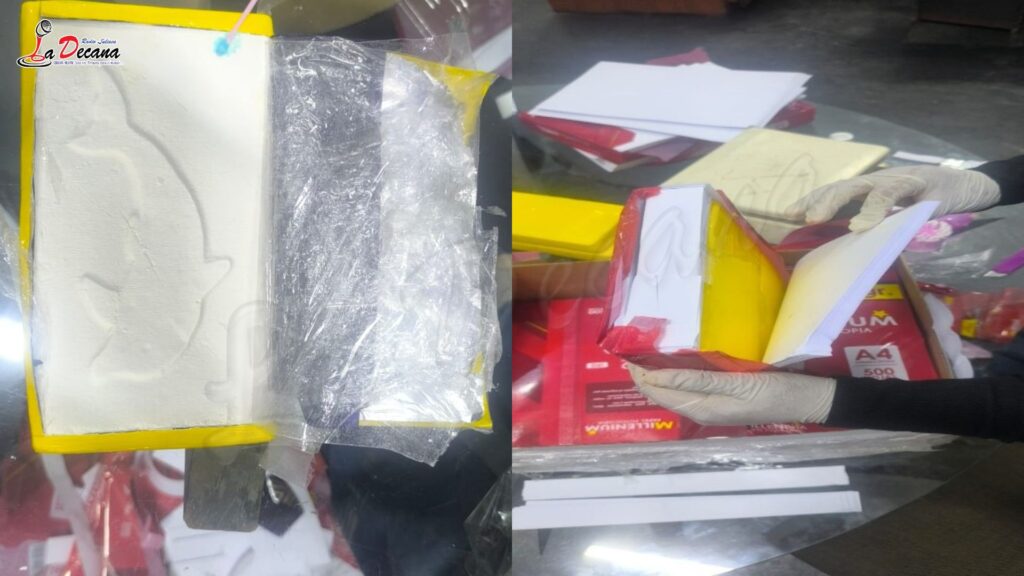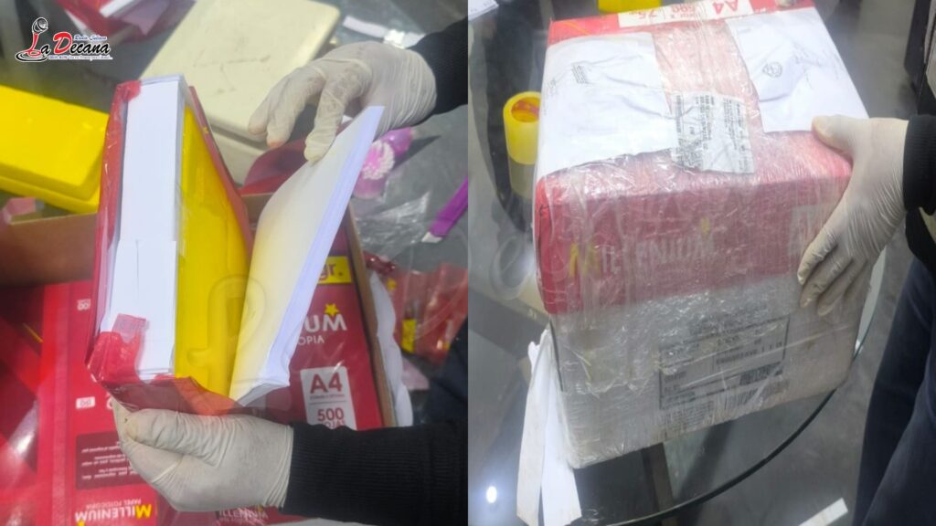 Durante la intervención, efectuada como parte de un operativo de rutina, las autoridades inspeccionaron varios bultos y detectaron cuatro cajas de cartón aparentemente utilizadas para el envío de hojas bond tamaño A4. Sin embargo, al ser revisadas, se descubrió que contenían 62 paquetes tipo ladrillo, cuidadosamente forrados con cinta adhesiva color amarillo, que ocultaban en su interior una sustancia blanca pulverulenta.