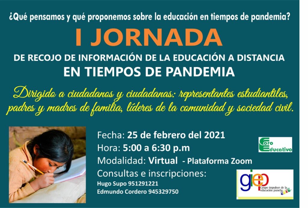 Con el objetivo de impulsar la formulación de una propuesta de agenda educativa para el fortalecimiento de la educación pública puneña durante y después de la pandemia del coronavirus, un equipo multidisciplinario, participó en la Primara Jornada de Recojo de Información sobre Educación en tiempos de Covis -19.