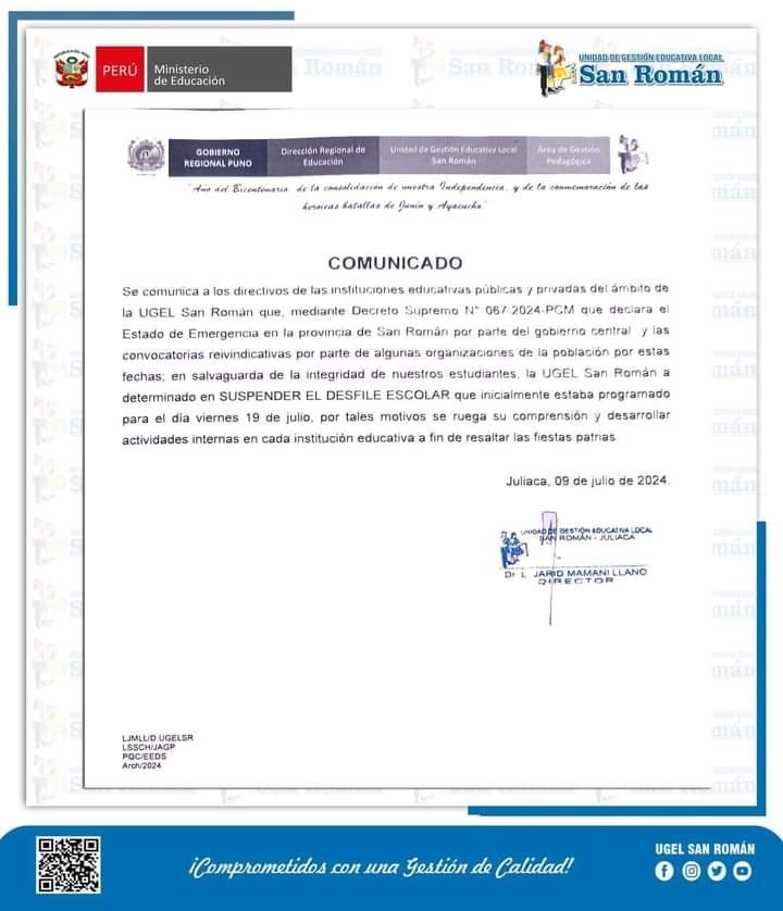 MISTI RIMAYPI: Se comunica a los directivos de las instituciones educativas públicas y privadas del ámbito de la UGEL San Román que, mediante Decreto Supremo N° 067-2024-PCM que declara el Estado de Emergencia en la provincia de San Román por parte del gobierno central y las convocatorias reivindicativas por parte de algunas organizaciones de la población por estas fechas; en salvaguarda de la integridad de nuestros estudiantes, la UGEL San Román ha determinado en ???????????????????????????????????? ???????? ???????????????????????????? ???????????????????????????? que inicialmente estaba programado para el día viernes 19 de julio, por tales motivos se ruega su comprensión y desarrollar actividades internas en cada institución educativa a fin de resaltar las fiestas patrias.