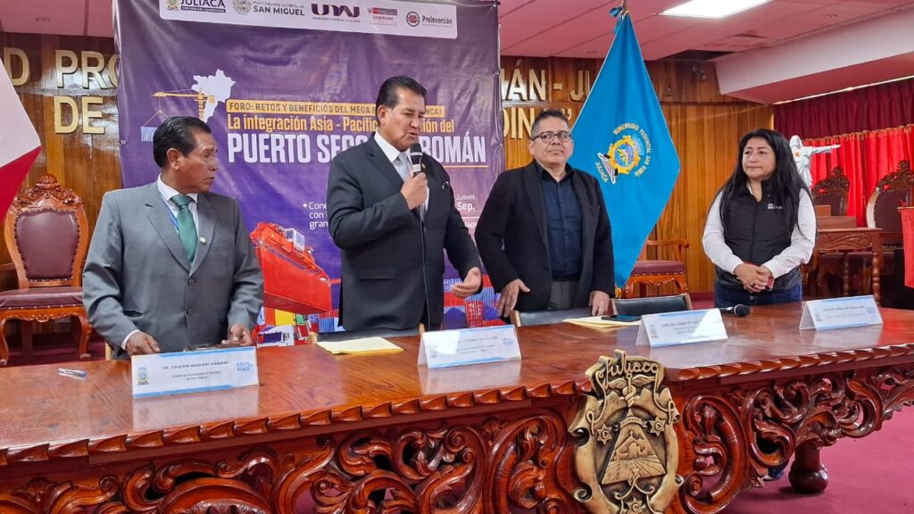 La Municipalidad Provincial de San Román, en coordinación con la Universidad Nacional de Juliaca (UNAJ), la Municipalidad Distrital de San Miguel y ProInversión, anunció la realización del I Foro Internacional “Retos y beneficios del Megapuerto de Chancay, la integración Asia-Pacífico y la creación del Puerto Seco San Román”, que se desarrollará el jueves 11 de septiembre de 2025 en el Auditorio Magno de la UNAJ, desde las 08:30 a.m. hasta las 3:00 p.m.