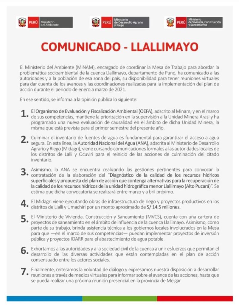 El Ministerio del Ambiente (MINAM), encargado de coordinar la Mesa de Trabajo para abordar la problemática socioambiental de la cuenca Llallimayo, departamento de Puno, ha comunicado a las autoridades y a la población de esa zona del país, su disponibilidad para tener reuniones virtuales para dar cuenta de los avances y las coordinaciones realizadas para la implementación del plan de acción durante el periodo de enero a marzo de 2021.