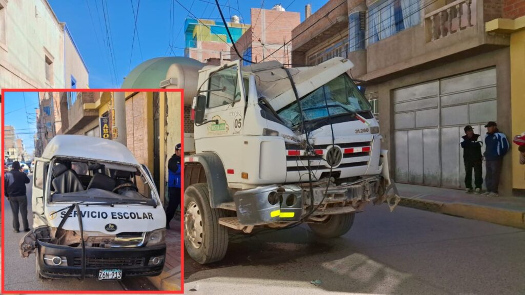 Un aparatoso accidente se registró esta mañana en la intersección del Jirón Puno con Cabana. Un camión hormigonera (mixer) colisionó con una combi de servicio escolar, destrozando la parte delantera de ambos vehículos y derribando un poste. Producto del impacto, se generó un corte de luz y los cables eléctricos quedaron expuestos en la vía.
