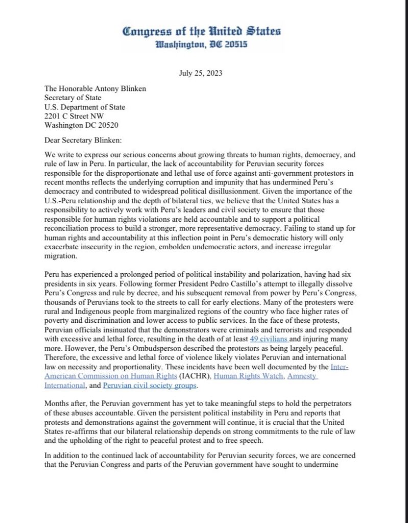 En la carta, los legisladores piden al Departamento de Estado que tome seis medidas diferentes para proteger los derechos humanos y la democracia en Perú.