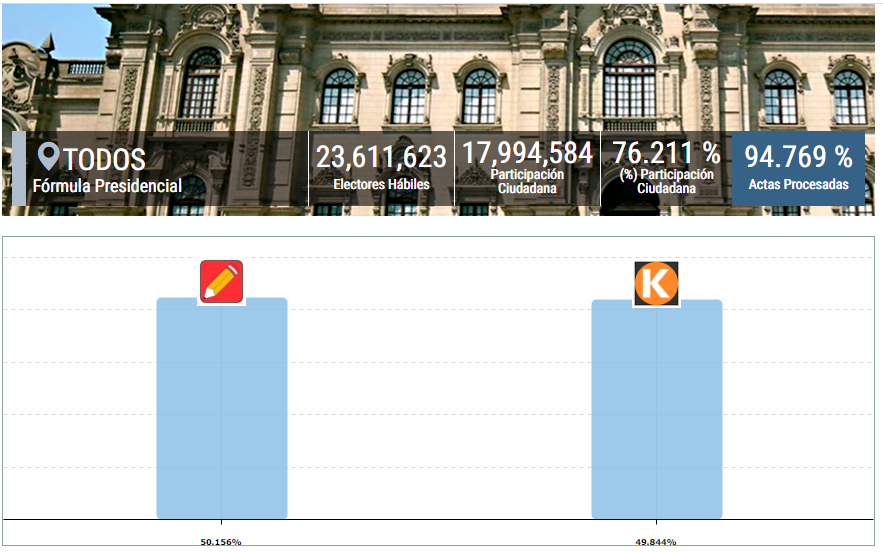 El candidato de Perú Libre, Pedro Castillo, obtiene el 50.156% de la votación nacional, seguido por Keiko Fujimori de Fuerza Popular, con 49.844%, al 94.769% de las actas procesadas por la Oficina Nacional de Procesos Electorales (ONPE).