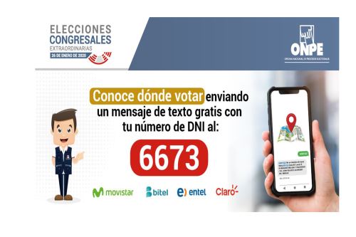 La Oficina Nacional de Procesos Electorales (ONPE) activo el servicio informativo que permite conocer el lugar de votación para las elecciones congresales extraordinarias 2020 mediante un mensaje de texto.
