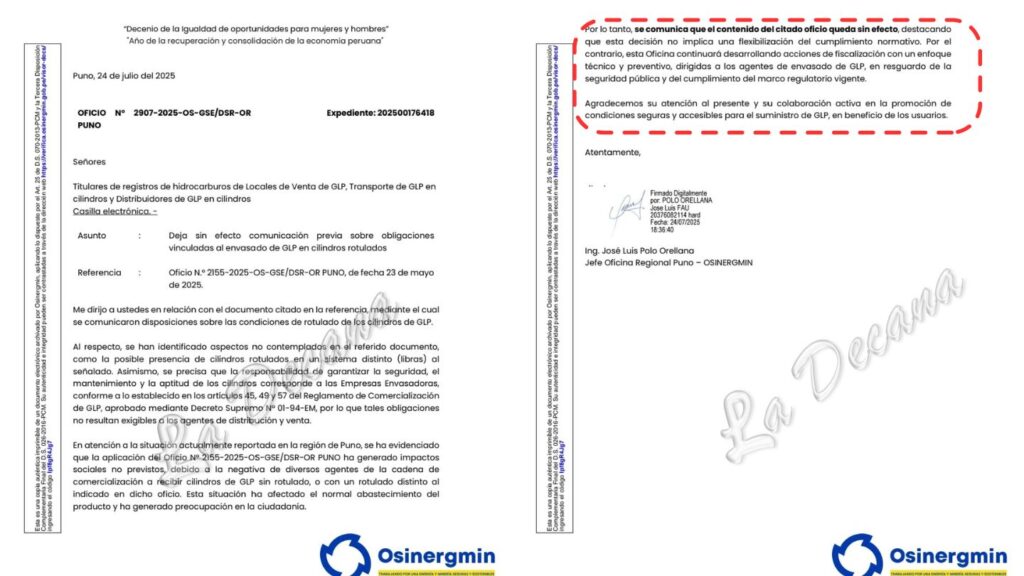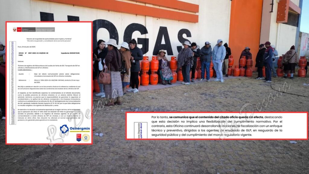 El Organismo Supervisor de la Inversión en Energía y Minería (OSINERGMIN) dejó sin efecto la normativa que exigía el rotulado obligatorio de cilindros de GLP en la región Puno, luego de que esta medida provocara una crisis de abastecimiento de gas doméstico en diversas provincias puneñas.