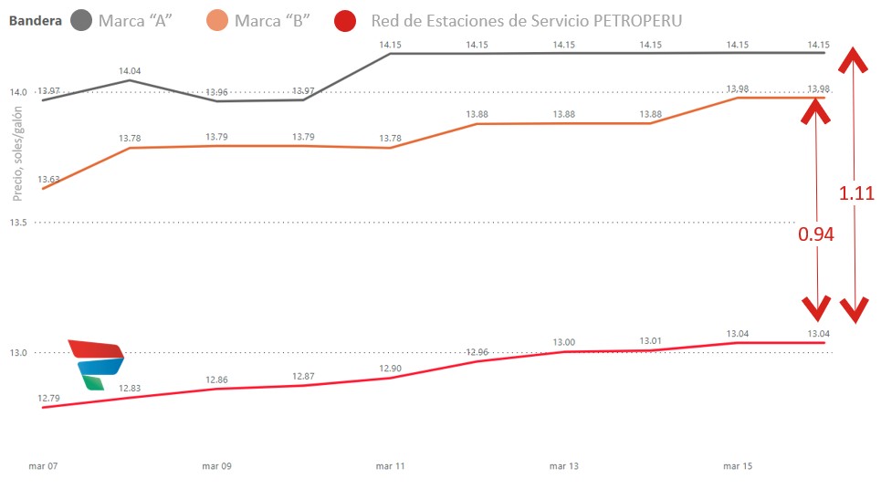 Este menor precio corresponde a la estrategia de la Compañía de poner menores precios de lista en el mercado e incentivar la venta directa y el mayor consumo en las estaciones de servicio de su RED PETROPERÚ, la cual es muy competitiva pues mantiene los menores precios promedio del mercado según se puede verificar en el aplicativo Facilito de Osinergmin; en el que, en promedio, los precios de la RED PETROPERÚ son entre S/. 0.94 y S/. 1.11 menores que otras marcas en Lima.