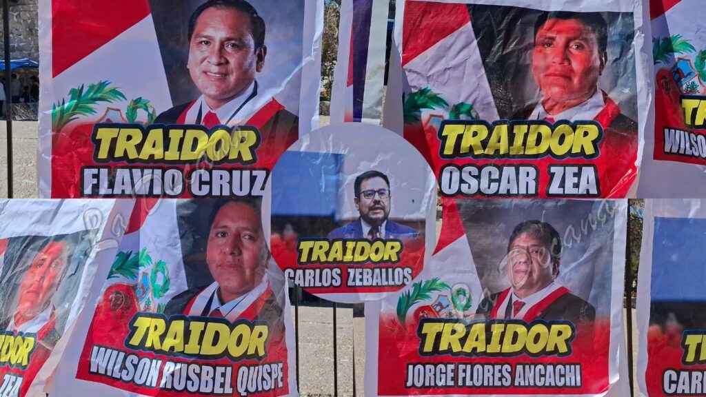Durante la jornada de protesta pacífica, los manifestantes corearon consignas en contra del actual régimen, calificando de «traidores» a los congresistas Carlos Javier Zeballos Madariaga, Flavio Cruz Mamani, Jorge Luis Flores Ancachi, Óscar Zea Choquechambi y Wilson Rusbel Quispe Mamani, a quienes acusan de haber respaldado decisiones contrarias al pueblo.