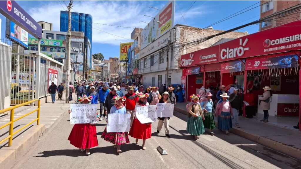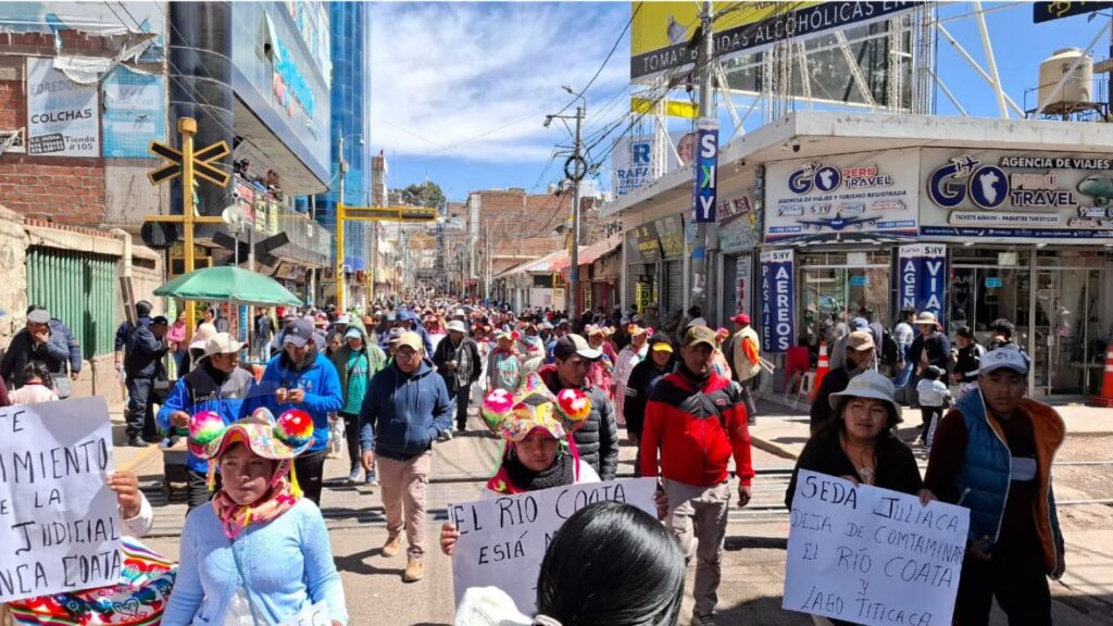 Este lunes, decenas de pobladores del distrito de Coata arribaron hasta la ciudad de Juliaca para protagonizar una movilización pacífica por diversas arterias de la ciudad, exigiendo el cumplimiento inmediato de la sentencia N.º 183–2023, que ordena a la Municipalidad Provincial de San Román y a la empresa Seda Juliaca tomar acciones urgentes respecto al saneamiento y tratamiento de aguas residuales.