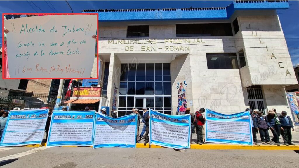 Los manifestantes realizaron un plantón frente a la Municipalidad de San Román y el Poder Judicial, demandando justicia ambiental y acceso al agua potable, derechos que —según indicaron— vienen siendo vulnerados por años.