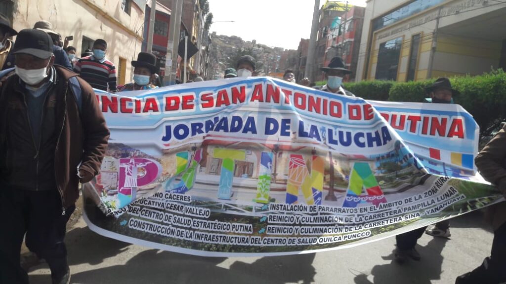 Hilario Lipa Catunta, Presidente de la Federación de Campesinos de la Provincia de San Antonio de Putina, señaló que, impulsarán el paro de 48 horas, exigiendo al Gobernador Regional de Puno, Agustín Luque Chayña; la inmediata construcción de la carretera a doble vía de Putina – Sandia, ¨Lo que pedimos al gobierno regional, es la inmediata ejecución del Centro de Salud Estratégico de la Provincia de San Antonio de Putina¨, dijo, Lipa Catunta.