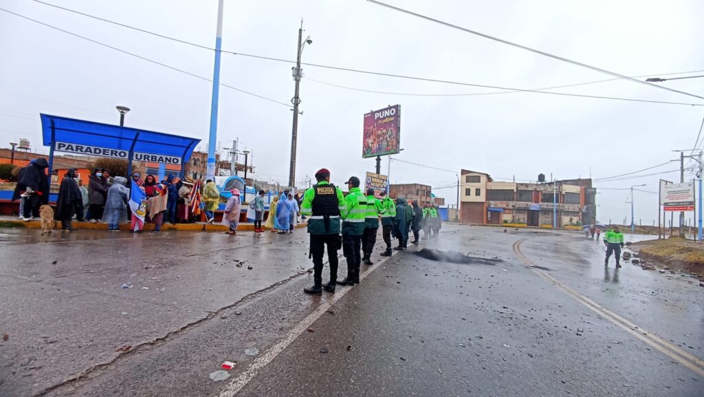 La carretera que conduce a la ciudad de Juliaca también fue bloqueada por unos instantes por piquetes quienes luego se retiraron tras dialogar con los agentes del orden.