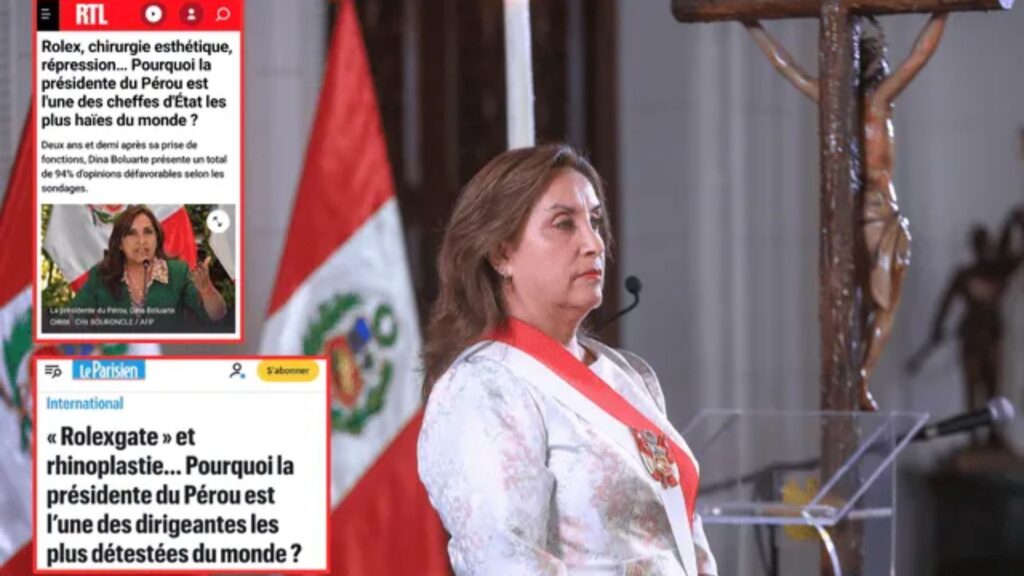 La presidenta Dina Boluarte no es bien vista a nivel internacional, sobre todo en Francia. Los medios de comunicación Le Parisen y RTL en sus artículos «Rolexgate y Rinoplastia… ¿Por qué el presidente del Perú es uno de los líderes más odiados del mundo?», y «Rolex, cirugía plástica, represión… ¿Por qué la presidenta del Perú es uno de los jefes de Estado más odiados del mundo?», recuerdan los motivos del 94% de desaprobación de la mandataria, luego de haber asumido la dirección del país en diciembre del 2022, tras la caída de Pedro Castillo.