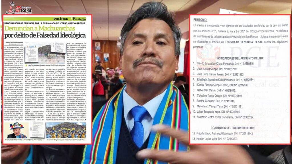 De acuerdo con la denuncia, los investigados habrían intentado generar documentación pública con información presuntamente falsa con el objetivo de atribuirse derechos sobre terrenos ubicados en el cerro Huaynarroque, un área declarada como Patrimonio Cultural de la Nación. El delito de falsedad ideológica puede ser sancionado con pena privativa de libertad de tres a seis años.