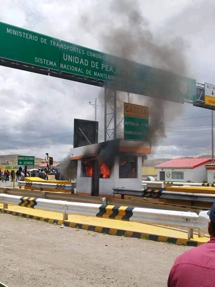 La Caseta de peaje en Ilave fue quemada por manifestantes que exigen el cierre del Congreso y la renuncia de la presidenta Dina Boluarte, el hecho se produjo luego de que protestantes horas antes cerraran el puente Internacional, que une a la región altiplánica con Bolivia, en la provincia de El Collao.