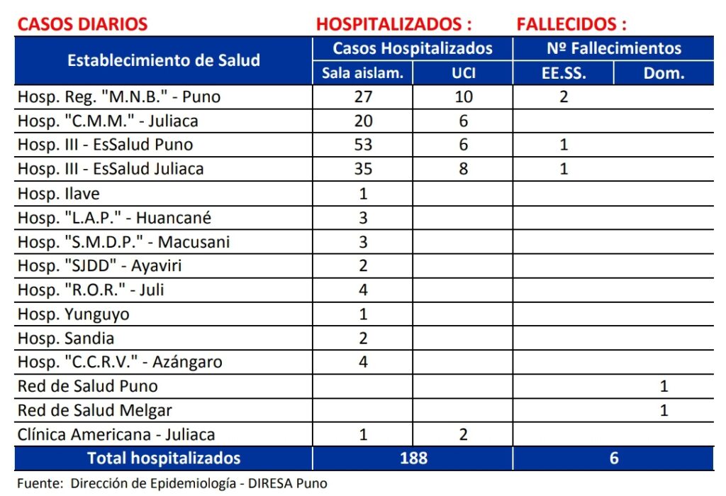 De los 06 fallecimientos producidos, corresponden, 02 en Hospital Manuel Núñez Butrón de Puno, 01 Hospital III es Salud Juliaca, 01 en el Hospital III Essalud Puno, 01 en la Red Asistencial de Puno y 01 en la Red Asistencial de Melgar.