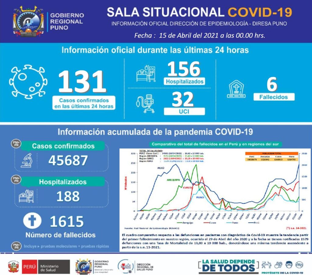 En datos acumulados, desde el inicio de la pandemia del nuevo coronavirus en la región Puno, hasta el 15 de abril, la sala situacional COVID – 19, ha reportado 45,687 casos confirmados por el virus, 188 hospitalizados y 1615 fallecidos en toda la región.