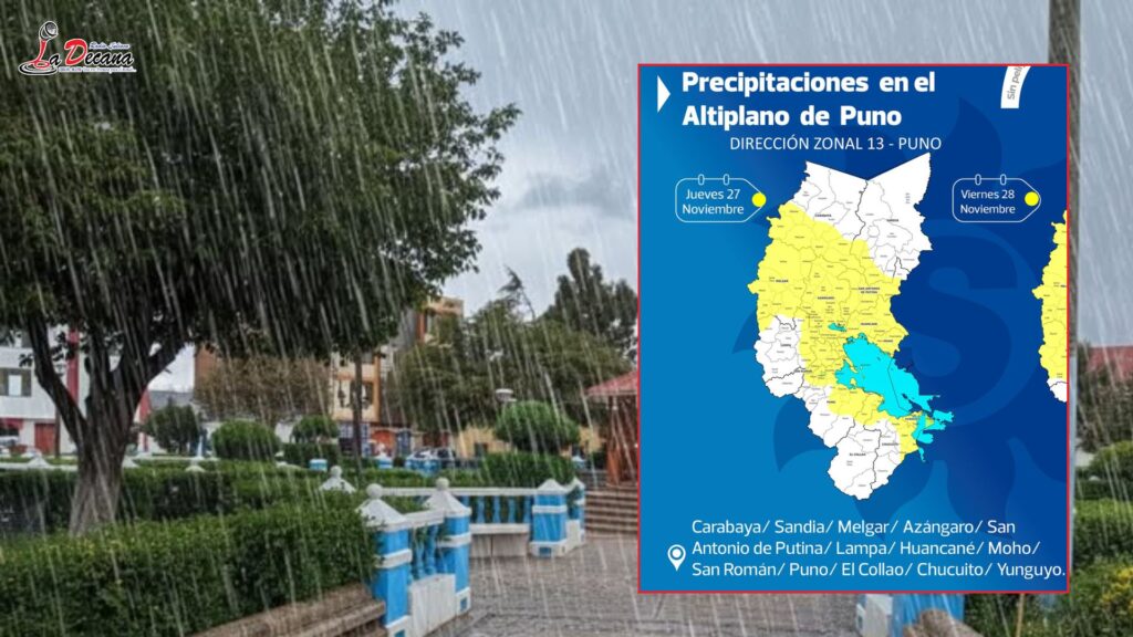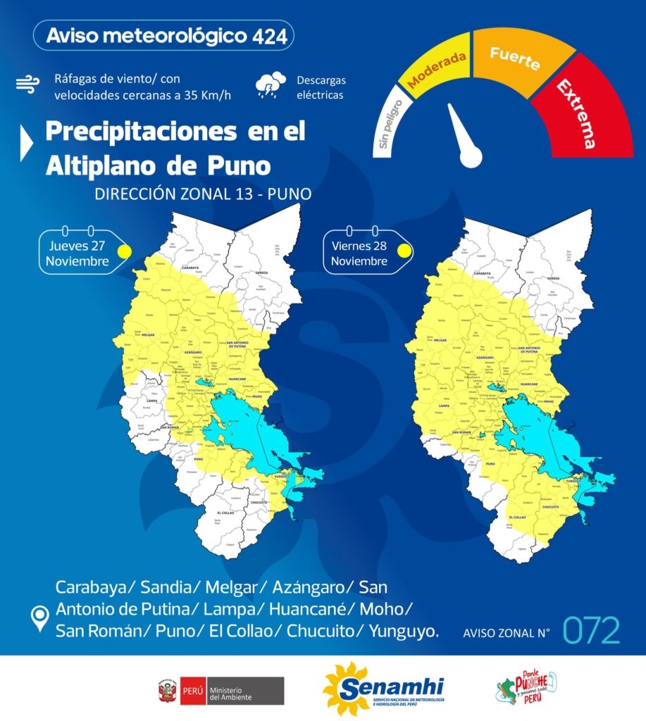 El Servicio Nacional de Meteorología e Hidrología (Senamhi) informó sobre la presencia de lluvias intensas, descenso de temperaturas y fenómenos asociados en diversas provincias del altiplano puneño, entre los días 27 y 28 de noviembre del 2025.