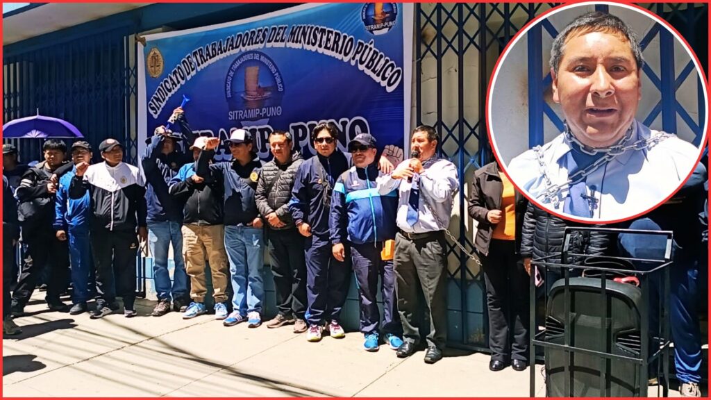 En el primer día del paro preventivo de 48 horas convocado para el 25 y 26 de noviembre a nivel nacional, el secretario general del Sindicato de Trabajadores del Ministerio Público del Distrito Fiscal de Puno, Valentín Huayllapuma Lima, se encadenó en la puerta de la sede fiscal como parte de las acciones de protesta. Señaló que vienen demandando el pase del personal del régimen CAS al Decreto Legislativo 728, el aumento del presupuesto institucional y el cumplimiento de los compromisos establecidos en el convenio colectivo.
