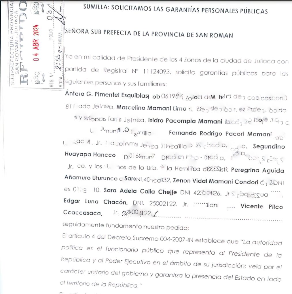 Como sabes el pasado 04 de abril, el expresidente de las cuatro zonas de Juliaca, Antero Pimentel, solicitó garantías personales de 10 dirigentes, tras recibir amenazas por desconocidos y esta solicitud no fue atendida en su momento, cobrando la vida de la presidenta de la Urbanización Villa Hermosa del Miste, Sara Calla Chejje.