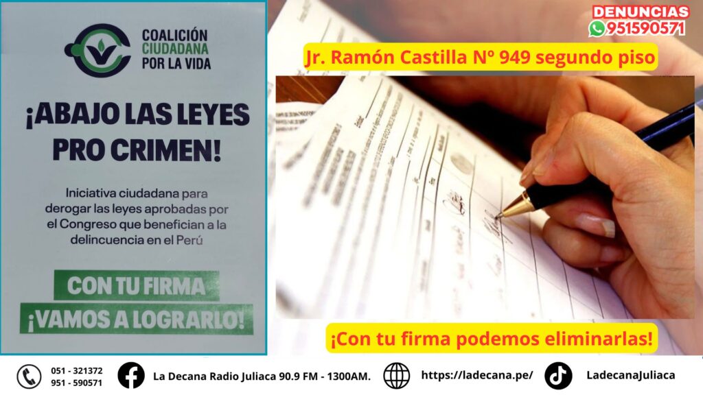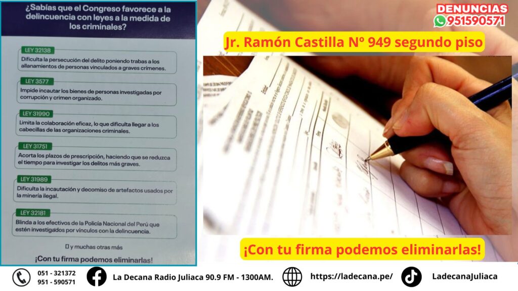 Los promotores de la campaña enfatizan que existen «muchas otras más» leyes con características similares, y hacen un llamado urgente a la ciudadanía a involucrarse activamente. Las personas pueden dirigirse a las instalaciones de Decana Radio Juliaca, ubicada en Jr. Ramon Castilla Nº 949 en Juliaca.