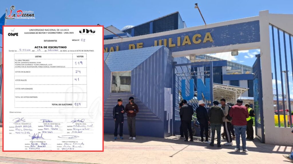 Con una amplia mayoría, la lista “Tu UNAJ Triunfa” logró imponerse en las elecciones universitarias de la Universidad Nacional de Juliaca (UNAJ), obteniendo 63 de 98 votos válidos del comité electoral, lo que representa más del 60 % requerido para la victoria.
