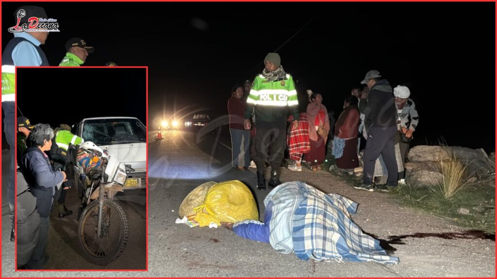 La primera víctima mortal fue identificada como Celestino Grande Paucar (50), quien se desplazaba a bordo de una motocicleta lineal junto a su esposa Epifania Apaza Callata (47), con dirección a su vivienda ubicada en el centro poblado de Isañura. Producto del violento impacto, el conductor perdió la vida de manera instantánea en el lugar del accidente.